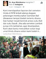 Berikut saya kutip tulisan Weda lewat akun Instagramnya: "Kami mendapatkan laporan dari semeton Hindu di NTB terkait adanya dugaan pelarangan membunyikan Gamelan Bali dikawasan tempat ibadah tertentu disana. Dan hampir terjadi bentrok antara suku Bali dan suku Sasak. Jika ada semeton Lombok punya info tambahan, agar disampaikan. Kami akan bantu mencarikan solusi bagi umat Hindu disana selain kami butuh informasi berimbang. Syukurlah aparat keamanan sudah sigap dan sdh ada hasil positif dari mediasi. Mhn semeton Hindu utamakan Ahimsa, jika ada masalah acuannya adalah UU dan hukum positif. Semoga damai. ( admin ) @jokowi @puspentni #thehinducenterofntb".